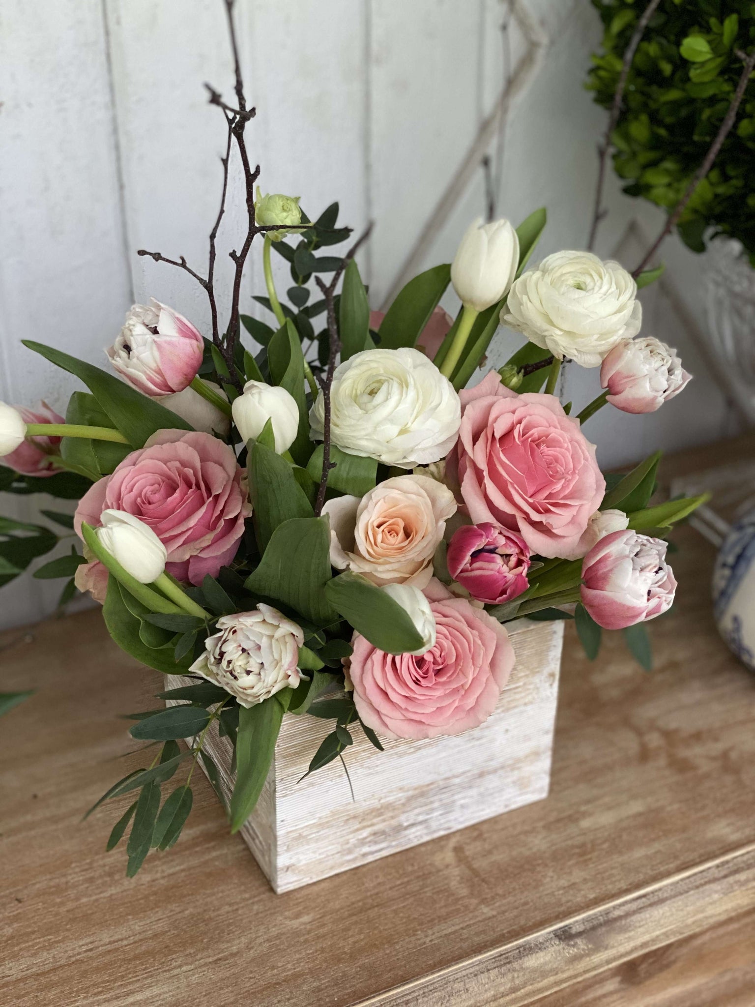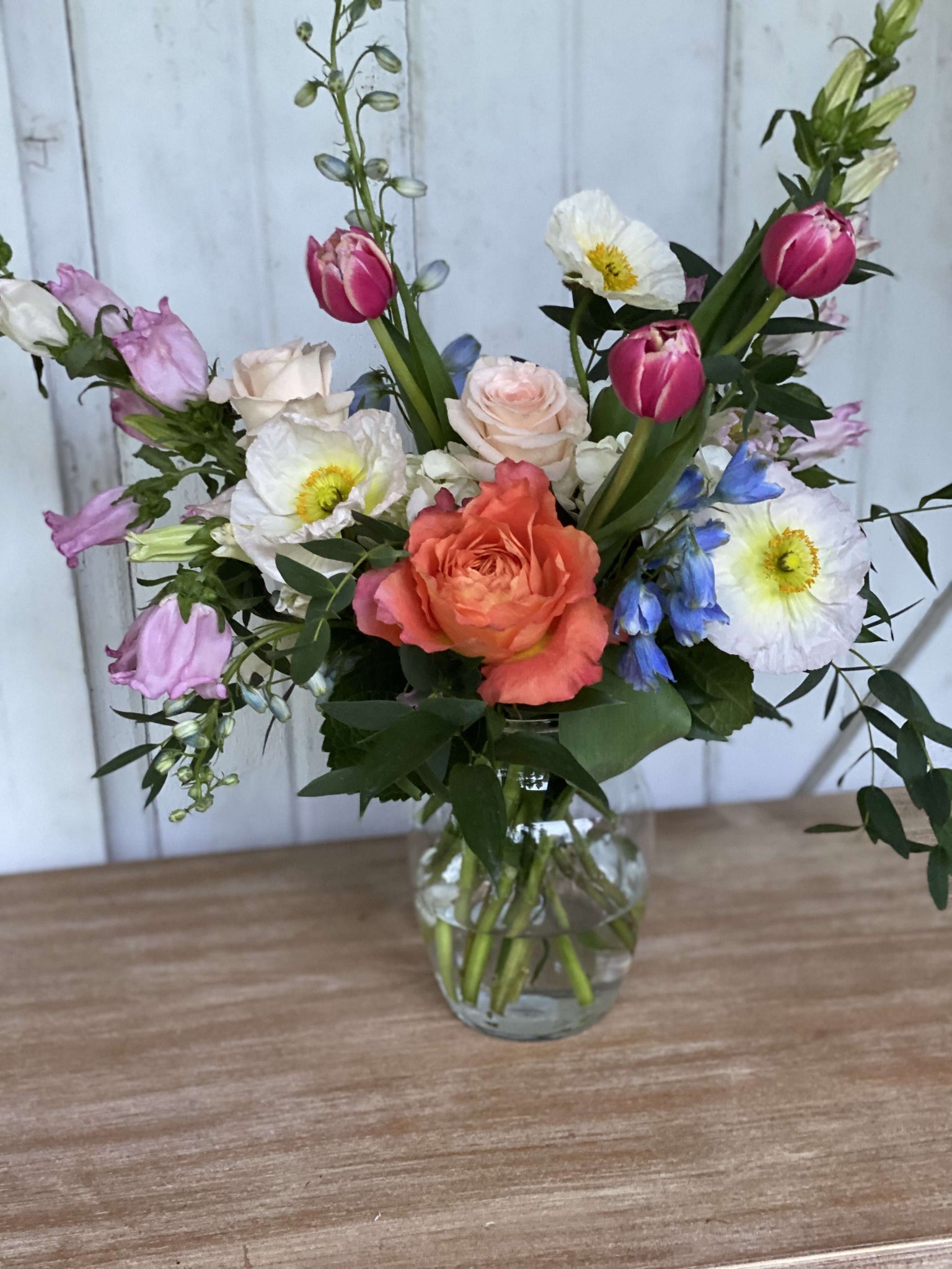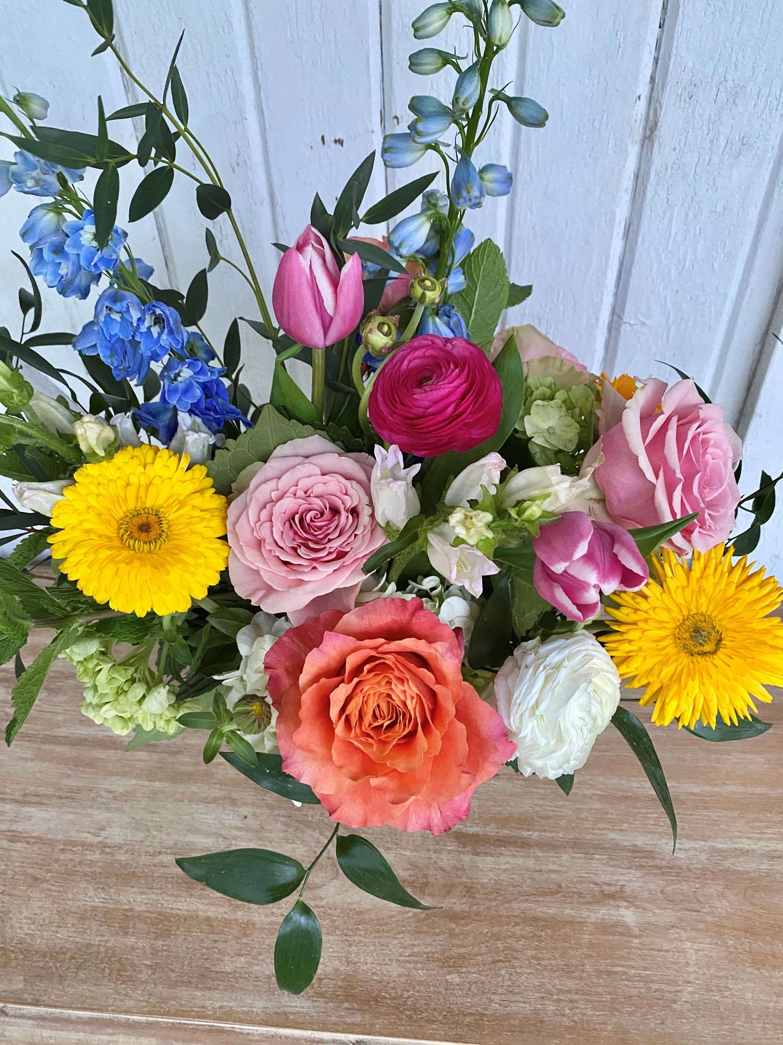 The Midi is packed full of blooms and is sure to impress. Comprised of the season's most stunning blooms and foliages, it is the perfect size for most spaces as it’s not too big and not too small for any location. The pictures shown are examples of arrangements similar in size and quality of those you will receive. Flowers and colors will vary from week to week making each delivery a an exciting highlight of your day.
